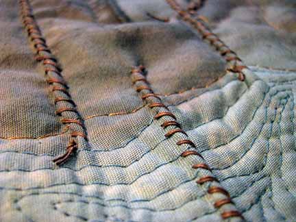 Cutch and compost dyeing on silk chiffon crepe type fabric. Wool quilt batting, natural dyed cotton batting, Aurifil Threads, machine stitched.